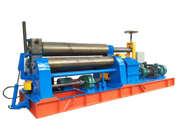 該機(jī)為對稱式三輥卷板機(jī),兩下輥為主動(dòng)固定輥,上輥通過升降絲桿、渦輪、蝸桿在兩下輥對稱中央作上下移動(dòng),兩下輥的正、反旋轉(zhuǎn)和上輥的升降移動(dòng)均靠電機(jī)帶動(dòng)減速器來完成,并能借助手動(dòng)離合器把上輥調(diào)節(jié)成平行或傾斜位置,以適應(yīng)卷制圓形和錐形工件的需要,尾端設(shè)有液壓倒頭翻轉(zhuǎn)裝置,有電器控制,取代了一般三輥卷板機(jī)使用人工倒頭的方法,渦輪上下配有特種壓力軸承,轉(zhuǎn)動(dòng)輕松、省電耐磨。該機(jī)集機(jī)身、傳動(dòng)、液壓、電器部分為一整體,其結(jié)構(gòu)緊湊、操作方便、便于搬運(yùn)、安裝和維護(hù)。